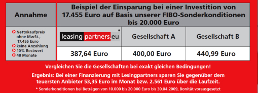 So lassen sich bei den diversen Anbietern von Fitness-Leasing Unterschiede in den Monatsraten von leicht 560 Euro pro Monat feststellen von seriösen zu unseriösen Anbietern. Auf die volle Laufzeit eines Vertrages von 54 Monaten gerechnet ergibt sich hier eine extreme Belastung von über 22 000 Euro bei überteuerten Anbietern bzw. ein mögliches Einsparungspotential bei der Wahl einer seriösen Gesellschaft.